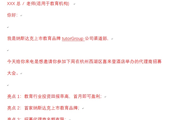 iTutorGroup在線教育集團于2001年創(chuàng)立,是全球最大的教育集團,布局全世界80多個國家,擁有5000多位員工、超過20000名外籍顧問,每年提供3000萬堂在線課程。ITutorGroup在全國各大城市召開代銷會,主推vipJr在線青少兒教育以及TutorABC成人在線英語。iTutorGroup在線教育集團中國公司找到贏想力合作,為每次的代銷會議邀約高質(zhì)量的潛在投資者到場。