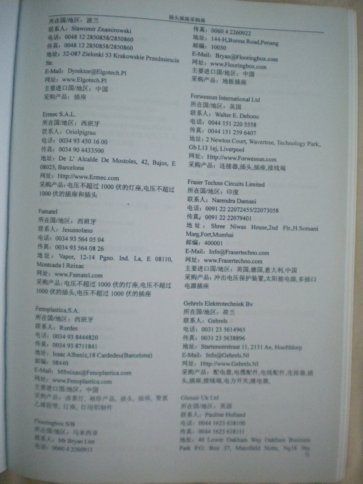 書(shū)刊簡(jiǎn)介:《全球采商黃頁(yè)》系列叢書(shū)是由全球最活躍的專業(yè)買家及重要國(guó)際性展會(huì)的到會(huì)采購(gòu)商名片信息匯編而成,包含三十多個(gè)行業(yè)分類,匯集了各類產(chǎn)品的買家信息。其中收錄的每家采購(gòu)商信息均是我們通過(guò)與買家面對(duì)面的登記整理收集而成,采購(gòu)意向明確,針對(duì)性強(qiáng)。為了確保信息的準(zhǔn)確性和時(shí)效性,我們定期進(jìn)行跟進(jìn)、回訪、補(bǔ)充及更新工作。每家采購(gòu)商信息包括國(guó)別、公司名稱、聯(lián)系人、地址、電話、傳真、電郵、網(wǎng)址、采購(gòu)產(chǎn)品等詳細(xì)內(nèi)容,每?jī)?cè)《黃頁(yè)》約有兩千家左右的采購(gòu)商信息。在當(dāng)前國(guó)際出口形勢(shì)日趨嚴(yán)峻的環(huán)境下,如何降低成本開(kāi)拓國(guó)際市場(chǎng),是每個(gè)出口企業(yè)急需尋找的答案,我們相信通過(guò)我們10多年的外貿(mào)信息服務(wù)經(jīng)驗(yàn)和最新的國(guó)際買家資源服務(wù),將會(huì)為您拓展全球市場(chǎng)提供最直接有效的幫助。專業(yè)對(duì)口的買家信息一定會(huì)幫助貴公司打開(kāi)更廣闊的外貿(mào)市場(chǎng)!