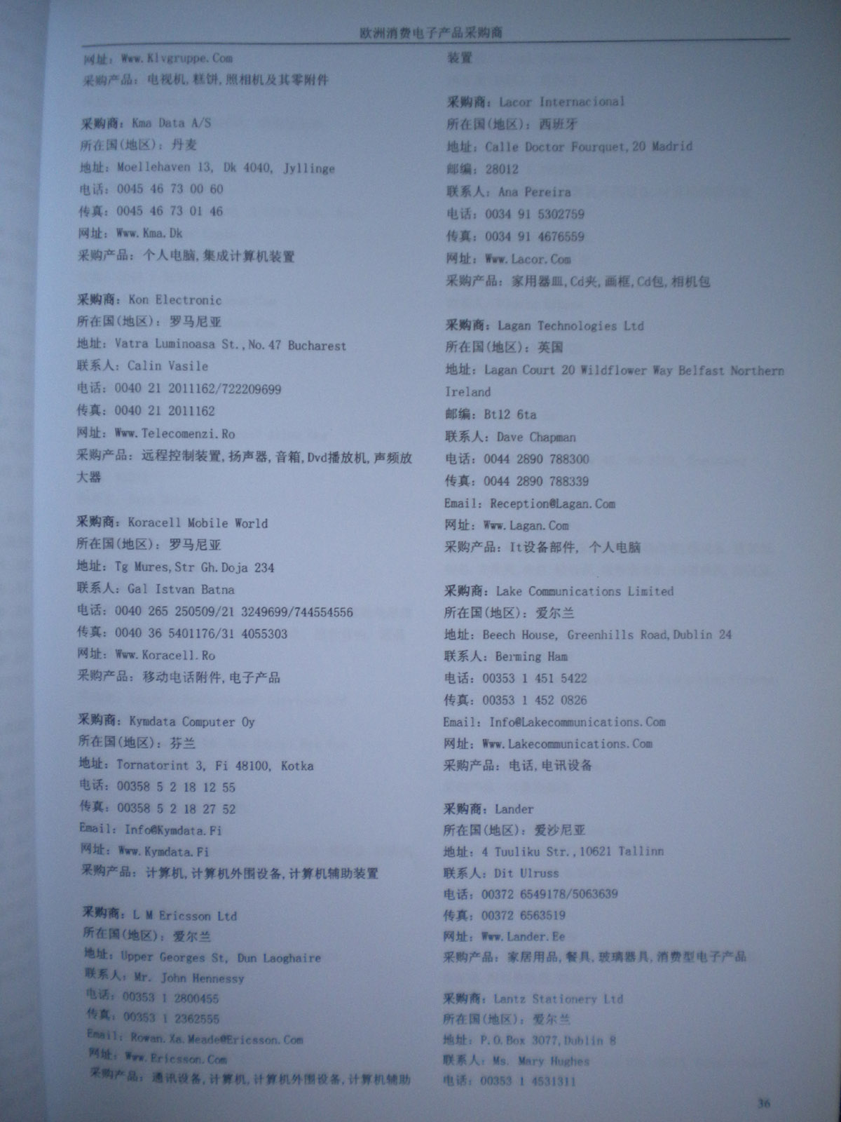 書刊簡介:《全球采商黃頁》系列叢書是由全球最活躍的專業買家及重要國際性展會的到會采購商名片信息匯編而成,包含三十多個行業分類,匯集了各類產品的買家信息。其中收錄的每家采購商信息均是我們通過與買家面對面的登記整理收集而成,采購意向明確,針對性強。為了確保信息的準確性和時效性,我們定期進行跟進、回訪、補充及更新工作。每家采購商信息包括國別、公司名稱、聯系人、地址、電話、傳真、電郵、網址、采購產品等詳細內容,每冊《黃頁》約有兩千家左右的采購商信息。在當前國際出口形勢日趨嚴峻的環境下,如何降低成本開拓國際市場,是每個出口企業急需尋找的答案,我們相信通過我們10多年的外貿信息服務經驗和最新的國際買家資源服務,將會為您拓展全球市場提供最直接有效的幫助。專業對口的買家信息一定會幫助貴公司打開更廣闊的外貿市場!