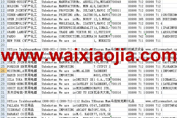 烏茲別克斯坦采購商名單數據為Excel格式,信息可任意修改、復制、打印、導出及導入到傳真、郵件群發等軟件中,無任何限制。