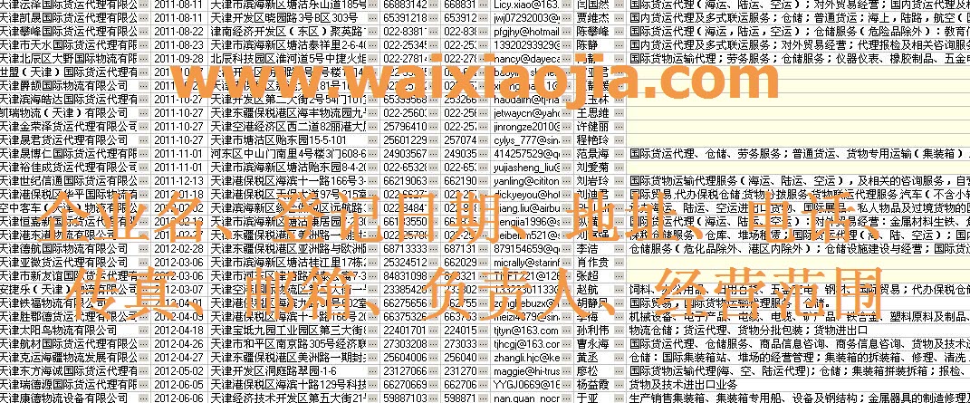 天津貨運代理公司名單數據為Excel格式,信息可任意修改、復制、打印、導出及導入到傳真、郵件群發等軟件中,無任何限制。