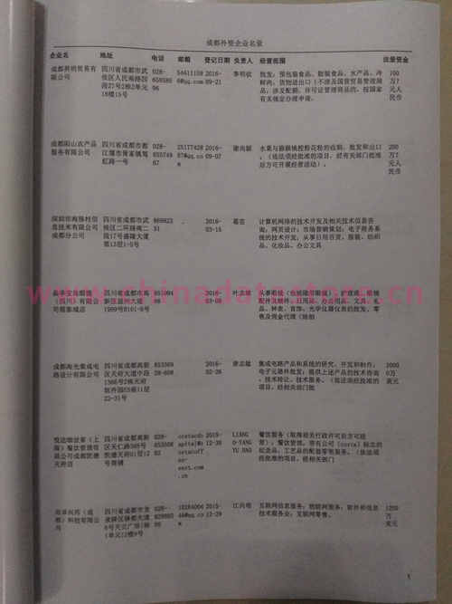 最新成都外資企業黃頁涵蓋了成都外商獨資企業、中外合資經營企業以及港、澳、臺資企業,包括成都日資臺資企業黃頁,成都外企黃頁具體內容包括:企業名稱、地址、電話、傳真、郵箱、經營范圍、注冊資金等信息;成都外資企業名單里面的企業都一些中外合資的大企業,這些公司經濟實力都比較雄厚,出口產品也比較多,業務范圍都比較廣,跟他們開展業務往來都比較容易;有了成都臺企日企黃頁開展業務也有了針對性,也省去了盲目去尋找客戶名單而浪費的時間了,工作效率也會有很大的提高.歡迎需要的客戶及時聯系我們!