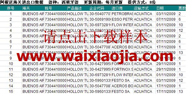 阿根廷進口關(guān)單數(shù)據(jù),以 阿根廷 本土企業(yè)向全球 200 多個國家和地區(qū)進口各類商品的進口申報單證為依據(jù)。按照具體產(chǎn)品的精確 HS 編碼提供。數(shù)據(jù)內(nèi)容包括:海關(guān)單標識符、通關(guān)日期、數(shù)據(jù)類型、海關(guān)編碼、進口商名稱、進口商地址、電話、進口關(guān)別、運輸方式、原產(chǎn)國、貿(mào)易國、 FOB 美元單價、 FOB 美元總價、 運費、保險、 CIF 美元總價、 數(shù)量、數(shù)量單位、凈重千克、運輸標志、附加數(shù)量、 FOB 單價、 FOB 總價、 貨幣單位、詳細產(chǎn)品描述、海關(guān)編碼詳細描述等情報內(nèi)容。
