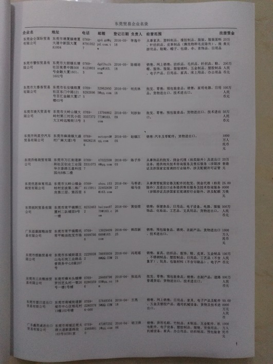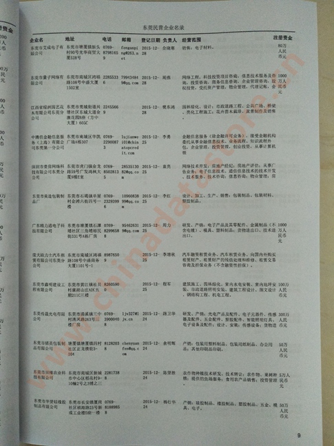 2021版最新東莞企業黃頁包括《東莞制造企業黃頁》、《東莞貿易企業黃頁》、《東莞民營企業黃頁》、《東莞外資企業黃頁》、《東莞外貿企業黃頁》共五冊,現優惠價:280元/冊。每冊內容包括:單位名稱、地址、郵編、電話、傳真、郵箱、經營范圍等;東莞企業黃頁涵蓋了近幾年來最新成立的、有一定規模的企業,具有非常高的營銷價值。有了這套黃頁開展業務也有了針對性,也省去了盲目去尋找客戶名單而浪費的時間了,工作效率也會有很大的提高。歡迎需要東莞企業黃頁的朋友及時聯系我們!