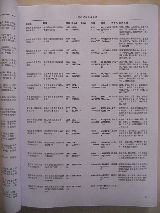 2021版最新青島企業(yè)黃頁包括《青島制造企業(yè)黃頁》、《青島貿(mào)易企業(yè)黃頁》、《青島民營企業(yè)黃頁》、《青島外資企業(yè)黃頁》、《青島外貿(mào)企業(yè)黃頁》共五冊,現(xiàn)優(yōu)惠價:280元/冊。每冊內(nèi)容包括:單位名稱、地址、郵編、電話、傳真、郵箱、經(jīng)營范圍等;青島企業(yè)黃頁涵蓋了近幾年來最新成立的、有一定規(guī)模的企業(yè),具有非常高的營銷價值。有了這套黃頁開展業(yè)務(wù)也有了針對性,也省去了盲目去尋找客戶名單而浪費的時間了,工作效率也會有很大的提高。歡迎需要青島企業(yè)黃頁的朋友及時聯(lián)系我們!