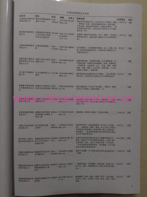 | 某省或直轄市 | 如上海、浙江冶煉鑄造企業名單 | 80% - 90% | 600元 | 附贈一冊冶煉鑄造紙質印刷品 |