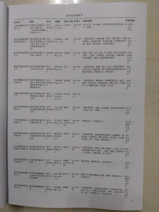2021版最新溫州企業黃頁包括《溫州制造企業黃頁》、《溫州貿易企業黃頁》、《溫州民營企業黃頁》、《溫州外資企業黃頁》、《溫州外貿企業黃頁》共五冊,現優惠價:280元/冊。每冊內容包括:單位名稱、地址、郵編、電話、傳真、郵箱、經營范圍等;溫州企業黃頁涵蓋了近幾年來最新成立的、有一定規模的企業,具有非常高的營銷價值。有了這套黃頁開展業務也有了針對性,也省去了盲目去尋找客戶名單而浪費的時間了,工作效率也會有很大的提高。歡迎需要溫州企業黃頁的朋友及時聯系我們!