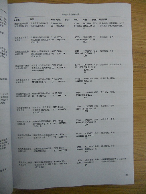 2021版最新珠海企業(yè)黃頁(yè)包括《珠海制造企業(yè)黃頁(yè)》、《珠海貿(mào)易企業(yè)黃頁(yè)》、《珠海民營(yíng)企業(yè)黃頁(yè)》、《珠海外資企業(yè)黃頁(yè)》、《珠海外貿(mào)企業(yè)黃頁(yè)》共五冊(cè),現(xiàn)優(yōu)惠價(jià):280元/冊(cè)。每?jī)?cè)內(nèi)容包括:?jiǎn)挝幻Q、地址、郵編、電話、傳真、郵箱、經(jīng)營(yíng)范圍等;珠海企業(yè)黃頁(yè)涵蓋了近幾年來(lái)最新成立的、有一定規(guī)模的企業(yè),具有非常高的營(yíng)銷價(jià)值。有了這套黃頁(yè)開展業(yè)務(wù)也有了針對(duì)性,也省去了盲目去尋找客戶名單而浪費(fèi)的時(shí)間了,工作效率也會(huì)有很大的提高。歡迎需要珠海企業(yè)黃頁(yè)的朋友及時(shí)聯(lián)系我們!