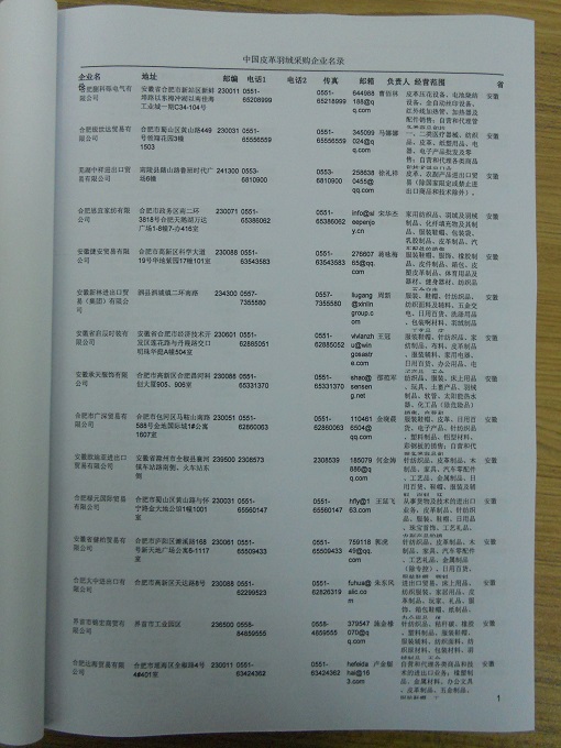 2025年新版中國皮革羽絨采購企業黃頁,收錄了全國各地經營范圍涉及皮革羽絨產品的貿易企業,這些都是頗具實力的皮革羽絨產品的中國采購商。黃頁內容包含:企業名稱、地址、電話、傳真、郵箱、經營范圍、省份、注冊資金等信息。該套黃頁包含一個黃頁光碟加一冊紙質書刊,全國價格:1500元,省/直轄市價格:400元,城市價格:200元,共收錄了全國各地大概55974(統計日期:2018.1)家皮革羽絨產品采購企業。黃頁光碟中是EXCEL格式,信息可任意修改、復制、打印、導出及導入到傳真、郵件群發等軟件中,無任何限制。