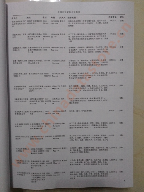2025年新版中國化工采購企業黃頁,收錄了全國各地經營范圍涉及化工產品的貿易企業,這些都是頗具實力的化工產品的中國采購商。黃頁內容包含:企業名稱、地址、電話、傳真、郵箱、經營范圍、省份、注冊資金等信息。該套黃頁包含一個黃頁光碟加一冊紙質書刊,全國價格:1500元,省/直轄市價格:400元,城市價格:200元,共收錄了全國各地大概77995(統計日期:2018.1)家化工產品采購企業。黃頁光碟中是EXCEL格式,信息可任意修改、復制、打印、導出及導入到傳真、郵件群發等軟件中,無任何限制。