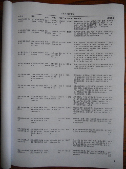 2021版最新邯鄲企業(yè)黃頁包括《邯鄲制造企業(yè)黃頁》、《邯鄲民營企業(yè)黃頁》,現(xiàn)優(yōu)惠價(jià):280元/冊。每冊內(nèi)容包括:單位名稱、地址、郵編、電話、傳真、郵箱、經(jīng)營范圍等;邯鄲企業(yè)黃頁涵蓋了近幾年來最新成立的、有一定規(guī)模的企業(yè),具有非常高的營銷價(jià)值。有了這套黃頁開展業(yè)務(wù)也有了針對(duì)性,也省去了盲目去尋找客戶名單而浪費(fèi)的時(shí)間了,工作效率也會(huì)有很大的提高。歡迎需要邯鄲企業(yè)黃頁的朋友及時(shí)聯(lián)系我們!