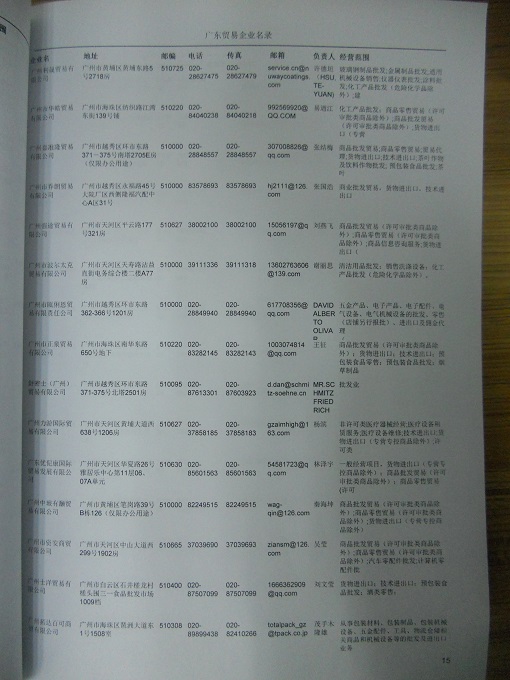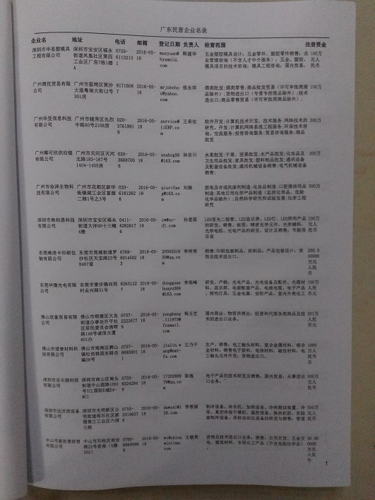 2021版最新廣東企業(yè)黃頁(yè)包括《廣東制造企業(yè)黃頁(yè)》、《廣東貿(mào)易企業(yè)黃頁(yè)》、《廣東民營(yíng)企業(yè)黃頁(yè)》共三冊(cè),優(yōu)惠價(jià):280元/冊(cè)。每?jī)?cè)內(nèi)容包括:?jiǎn)挝幻Q、地址、郵編、電話、傳真、郵箱、經(jīng)營(yíng)范圍等;廣東企業(yè)黃頁(yè)涵蓋了近幾年來最新成立的、有一定規(guī)模的企業(yè),具有非常高的營(yíng)銷價(jià)值。有了這套黃頁(yè)開展業(yè)務(wù)也有了針對(duì)性,也省去了盲目去尋找客戶名單而浪費(fèi)的時(shí)間了,工作效率也會(huì)有很大的提高。歡迎需要廣東企業(yè)黃頁(yè)的朋友及時(shí)聯(lián)系我們!