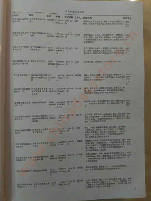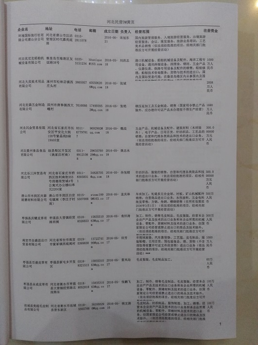2021版最新河北企業(yè)黃頁(yè)包括《河北制造企業(yè)黃頁(yè)》、《河北貿(mào)易企業(yè)黃頁(yè)》、《河北民營(yíng)企業(yè)黃頁(yè)》共三冊(cè),優(yōu)惠價(jià):280元/冊(cè)。每?jī)?cè)內(nèi)容包括:?jiǎn)挝幻Q、地址、郵編、電話、傳真、郵箱、經(jīng)營(yíng)范圍等;河北企業(yè)黃頁(yè)涵蓋了近幾年來(lái)最新成立的、有一定規(guī)模的企業(yè),具有非常高的營(yíng)銷價(jià)值。有了這套黃頁(yè)開(kāi)展業(yè)務(wù)也有了針對(duì)性,也省去了盲目去尋找客戶名單而浪費(fèi)的時(shí)間了,工作效率也會(huì)有很大的提高。歡迎需要河北企業(yè)黃頁(yè)的朋友及時(shí)聯(lián)系我們!