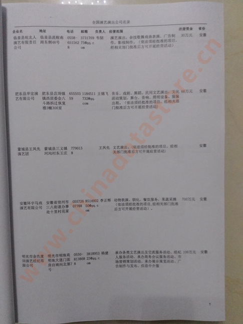 | 全國演藝演出企業黃頁 | 全國所有演藝演出企業黃頁 | 80% - 90% | 2000元 | 附贈上下冊演藝演出紙質印刷品 |