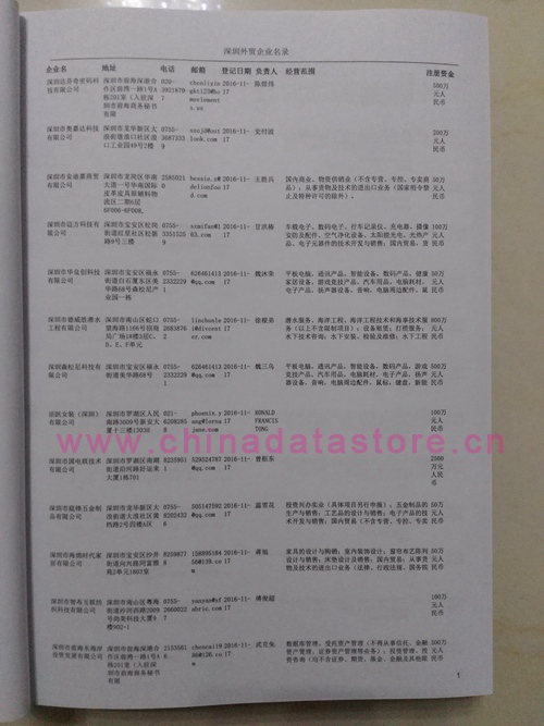 深圳外貿(mào)企業(yè)黃頁包括:外貿(mào)企業(yè)名稱、地址、電話、傳真、郵箱、經(jīng)營范圍、注冊資金等信息。