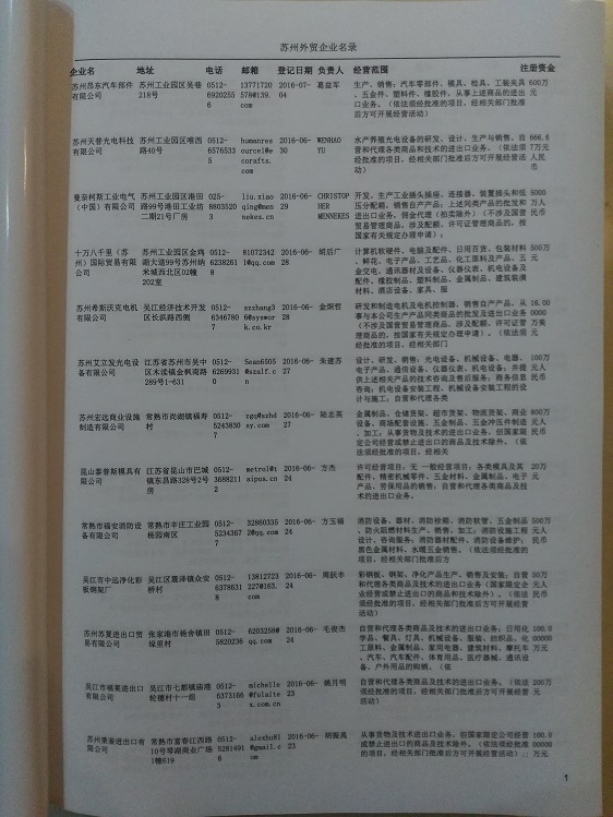 蘇州外貿(mào)企業(yè)黃頁包括:外貿(mào)企業(yè)名稱、地址、電話、傳真、郵箱、經(jīng)營范圍、注冊(cè)資金等信息。