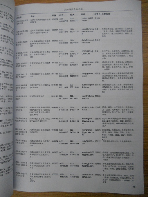 天津外貿(mào)企業(yè)黃頁包括:外貿(mào)企業(yè)名稱、地址、電話、傳真、郵箱、經(jīng)營范圍、注冊(cè)資金等信息。