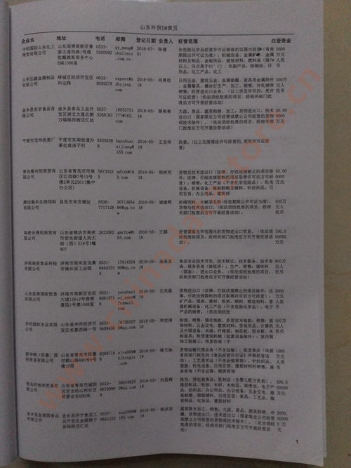 山東外貿企業黃頁包括:外貿企業名稱、地址、電話、傳真、郵箱、經營范圍、注冊資金等信息。