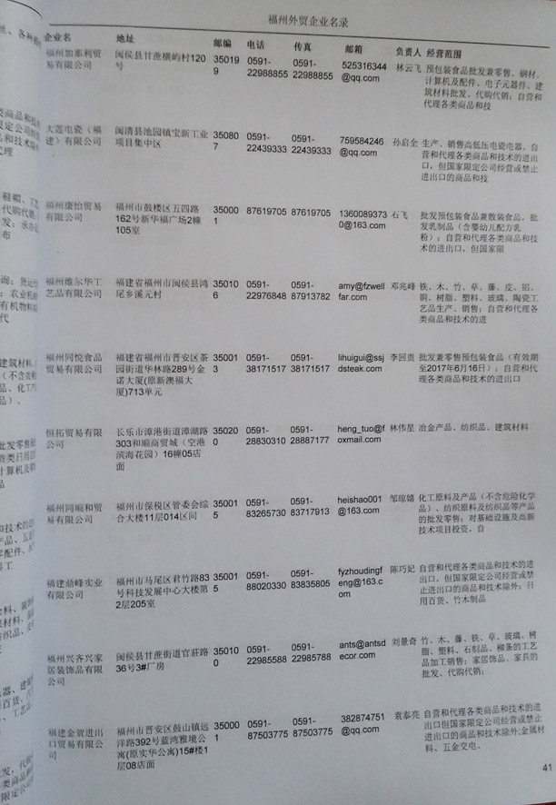 福州外貿企業黃頁包括:外貿企業名稱、地址、電話、傳真、郵箱、經營范圍、注冊資金等信息。