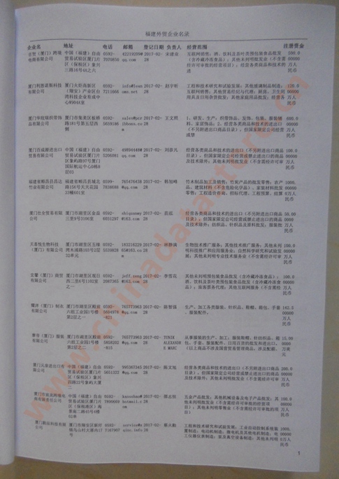 廈門外貿企業黃頁包括:外貿企業名稱、地址、電話、傳真、郵箱、經營范圍、注冊資金等信息。