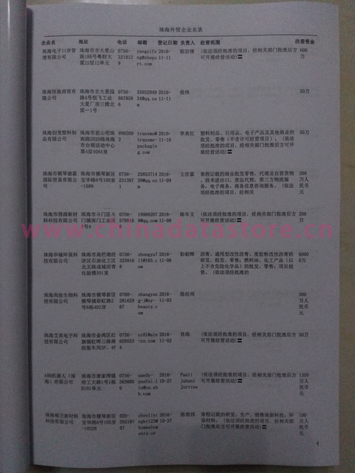 珠海外貿企業黃頁包括:外貿企業名稱、地址、電話、傳真、郵箱、經營范圍、注冊資金等信息。