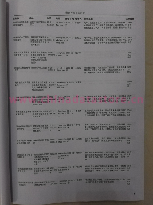 湖南外貿(mào)企業(yè)黃頁包括:外貿(mào)企業(yè)名稱、地址、電話、傳真、郵箱、經(jīng)營范圍、注冊資金等信息。