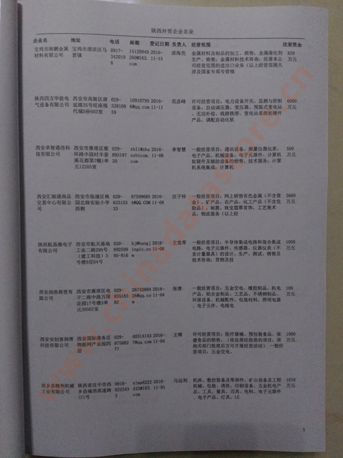 陜西外貿企業黃頁包括:外貿企業名稱、地址、電話、傳真、郵箱、經營范圍、注冊資金等信息。