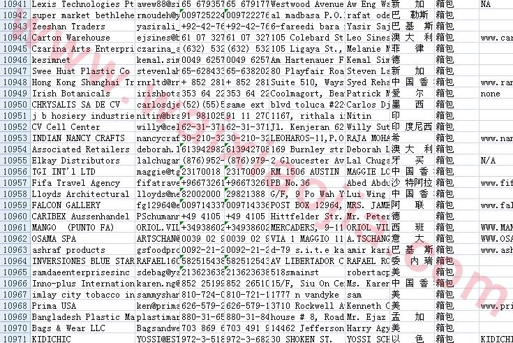 箱包皮具采購商名單數據為Excel格式,信息可任意修改、復制、打印、導出及導入到傳真、郵件群發等軟件中,無任何限制。