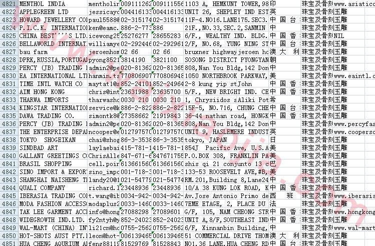 珠寶首飾采購商名單數(shù)據(jù)為Excel格式,信息可任意修改、復(fù)制、打印、導(dǎo)出及導(dǎo)入到傳真、郵件群發(fā)等軟件中,無任何限制。
