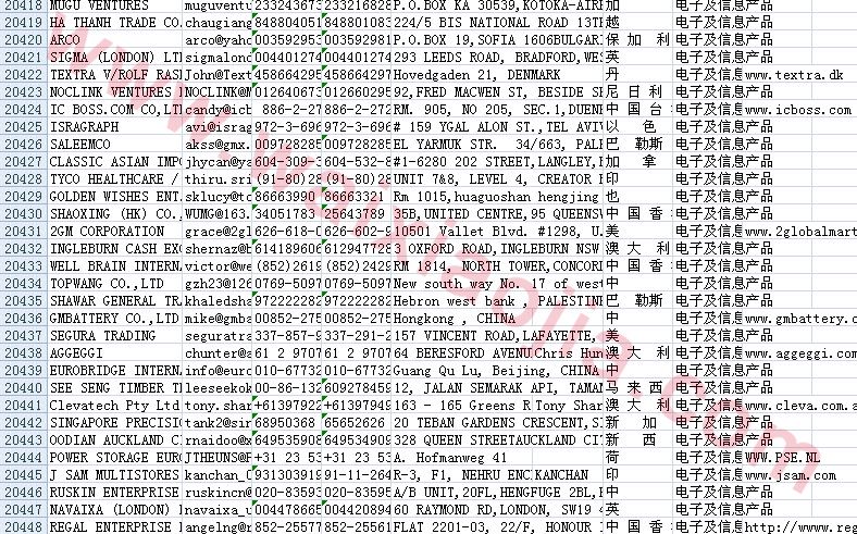 電子及信息產(chǎn)品采購商名單數(shù)據(jù)為Excel格式,信息可任意修改、復(fù)制、打印、導(dǎo)出及導(dǎo)入到傳真、郵件群發(fā)等軟件中,無任何限制。