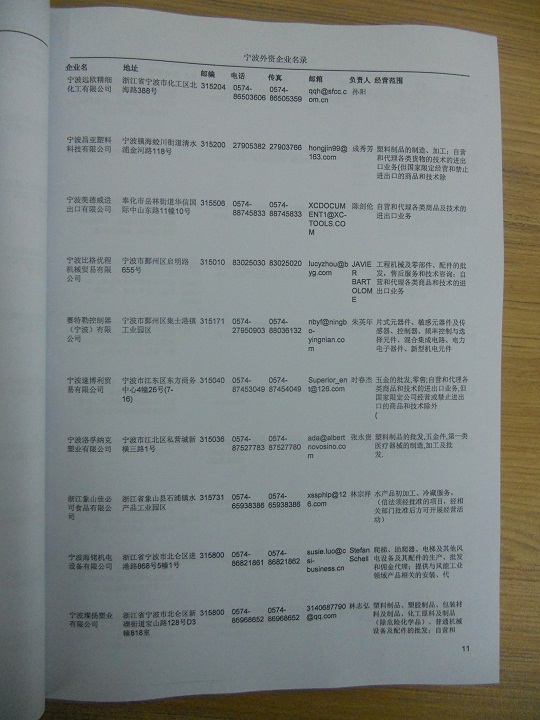 最新寧波外資企業(yè)黃頁涵蓋了寧波外商獨資企業(yè)、中外合資經(jīng)營企業(yè)以及港、澳、臺資企業(yè),包括寧波臺資日資企業(yè)黃頁,寧波外企黃頁具體內(nèi)容包括:企業(yè)名稱、地址、電話、傳真、郵箱、經(jīng)營范圍、注冊資金等信息;寧波外資企業(yè)黃頁里面的企業(yè)都一些中外合資的大企業(yè),這些公司經(jīng)濟實力都比較雄厚,出口產(chǎn)品也比較多,業(yè)務范圍都比較廣,跟他們開展業(yè)務往來都比較容易;有了寧波臺企日企黃頁開展業(yè)務也有了針對性,也省去了盲目去尋找客戶名單而浪費的時間了,工作效率也會有很大的提高.歡迎需要的客戶及時聯(lián)系我們!