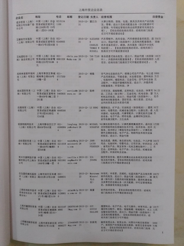最新上海外資企業黃頁涵蓋了上海外商獨資企業、中外合資經營企業以及港、澳、臺資企業,包括上海日企臺企黃頁等,具體內容包括:企業名稱、地址、電話、傳真、郵箱、經營范圍、注冊資金等信息;上海外資企業名單里面的企業都一些中外合資的大企業,這些公司經濟實力都比較雄厚,出口產品也比較多,業務范圍都比較廣,跟他們開展業務往來都比較容易;有了上海日資臺資等企業黃頁開展業務也有了針對性,也省去了盲目去尋找客戶名單而浪費的時間了,工作效率也會有很大的提高.歡迎需要客戶及時聯系我們!