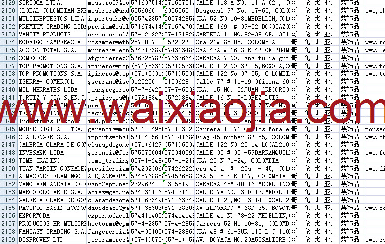 哥倫比亞采購商名單數(shù)據(jù)為Excel格式,信息可任意修改、復(fù)制、打印、導(dǎo)出及導(dǎo)入到傳真、郵件群發(fā)等軟件中,無任何限制。